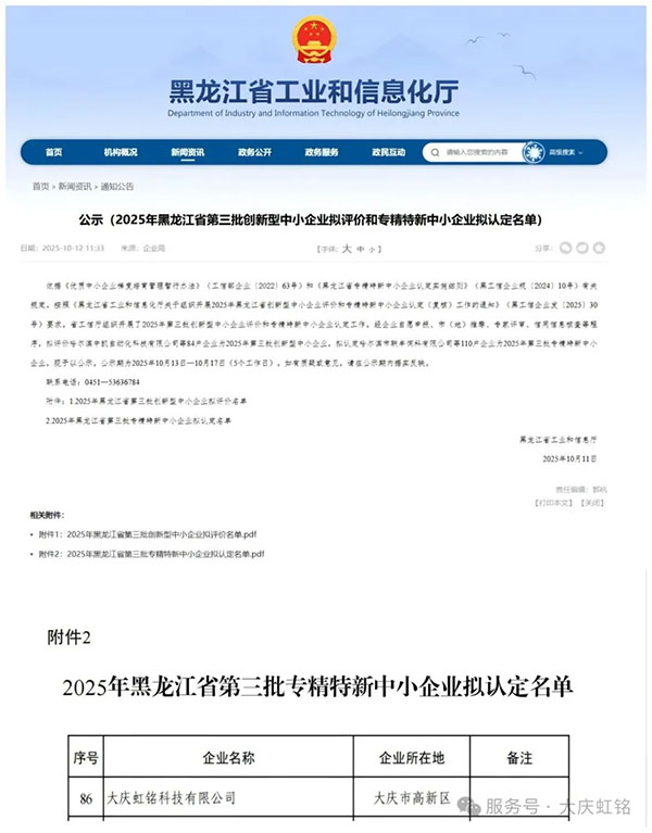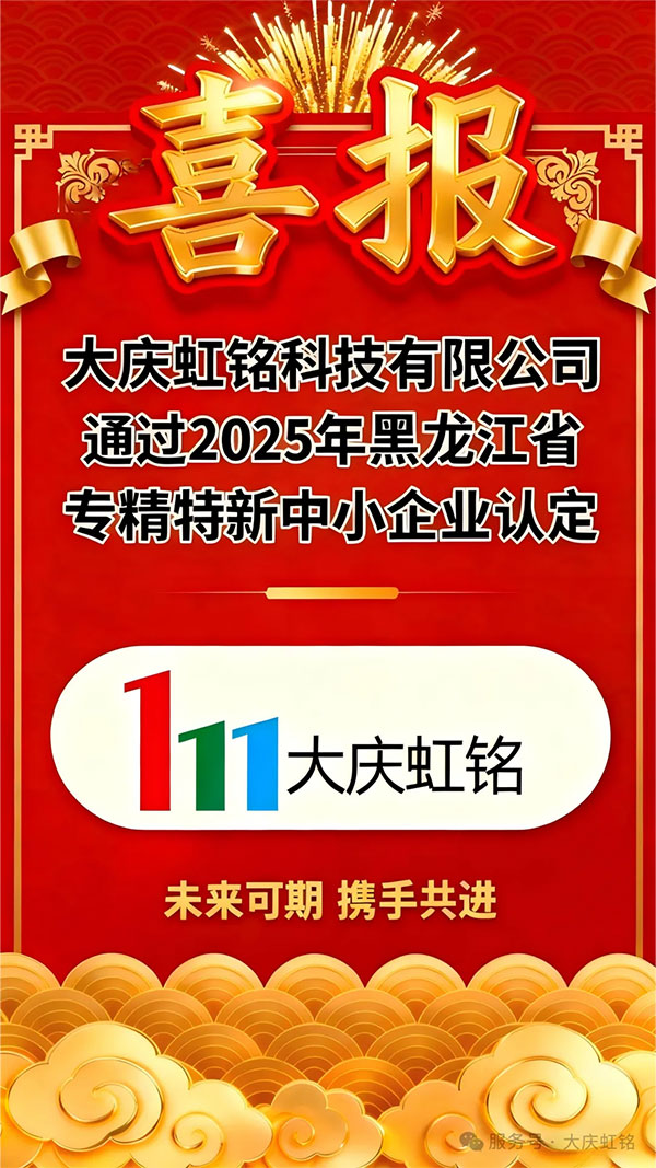 近日,黑龙江省工业和信息化厅公布了2025年度专精特新中小企业名单。凭借在**领域的深厚积淀、突出的创新能力以及稳健的发展态势,大庆虹铭科技有限公司顺利通过评审,成功跻身省级专精特新中小企业行列。